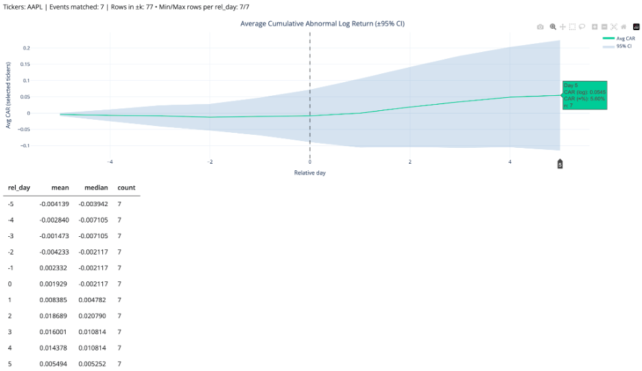 - With the Event Study, I choose the filing type (e.g., 10-Q), enter the ticker, set a date range and an event window in relative days, and hit Run. The app calculates and plots cumulative abnormal returns around each event, giving a compact view of how the stock has historically behaved in the days before and after those filings.