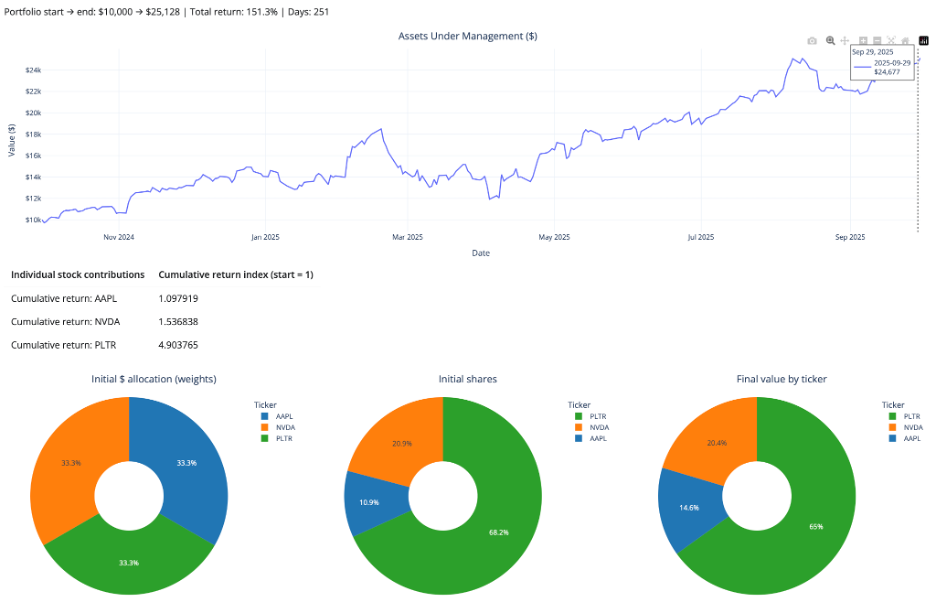 So, the answer to that first “real question” is: over this specific recent window, a simple equal-dollar buy-and-hold in AAPL/NVDA/PLTR would have more than doubled your money, with PLTR doing most of the heavy lifting.